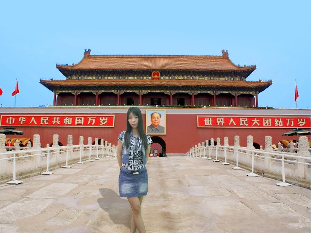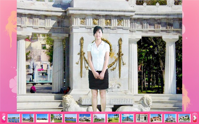 選好背景圖后按“拍照”鍵進入到拍照界面,你還可以根據(jù)背景的實際情況調(diào)節(jié)好人的大小“放大/縮小,人物的位置“方向鍵”。調(diào)整好后就按“拍照”鍵進行拍照