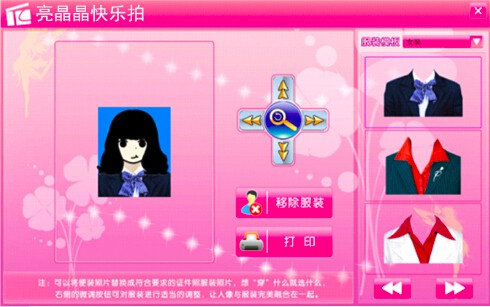 拍照完成后按“保存”鍵,會自動進入換裝界面,通過遙控器上的“放大/縮小”“左旋/右旋”鍵調(diào)節(jié)衣服的大小以及方向。若要打印,可直接點擊打印,若要退出重照,則點擊右上角的“”可退出換裝界面。