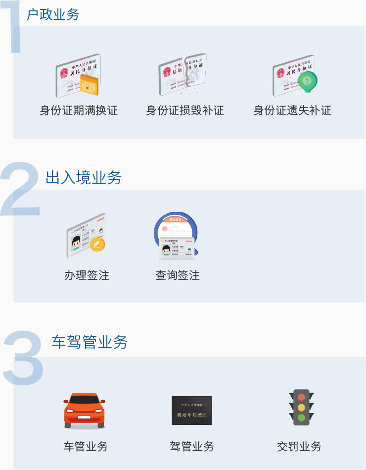 可自助辦理證件照拍攝、居住證業(yè)務(wù)、身份證補(bǔ)換領(lǐng)業(yè)務(wù)、駕駛證、行駛證查詢、違法信息查詢及其他業(yè)務(wù)辦理、港澳簽注業(yè)務(wù)辦理。